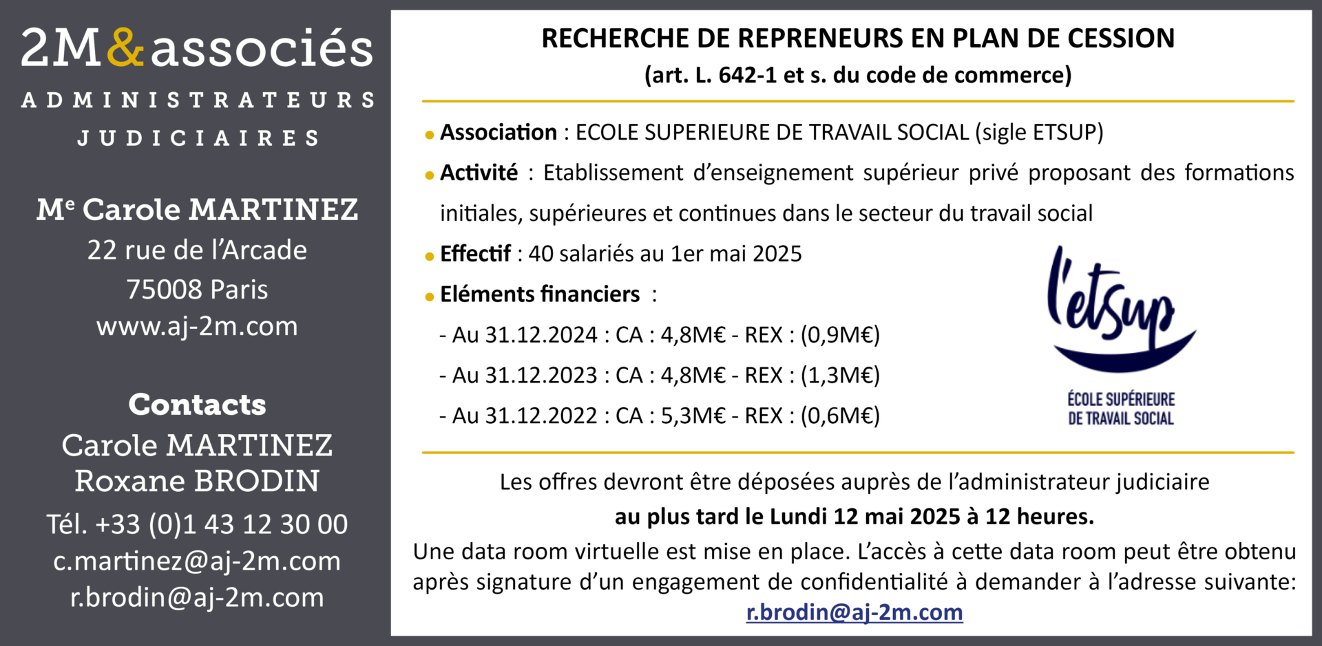 ASSOCIATION ETSUP – RECHERCHE DE REPRENEURS EN PLAN DE CESSION